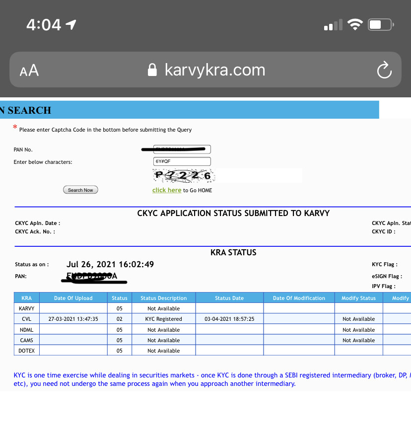 KRA application status: the one shared by your MF app ( Zerodha, Groww etc)