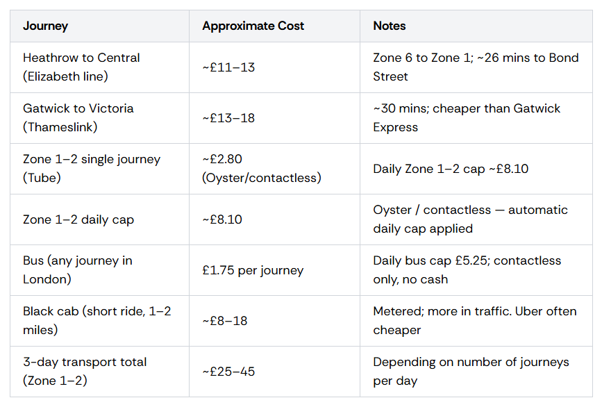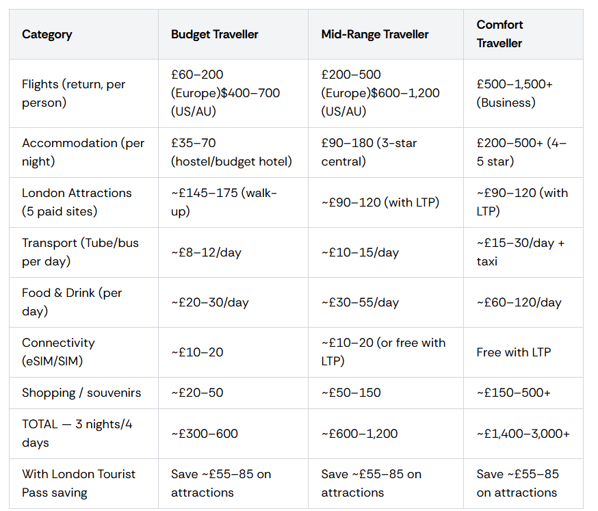 Here’s every major cost category for a typical 3-night, 4-day London trip, across three spending levels: