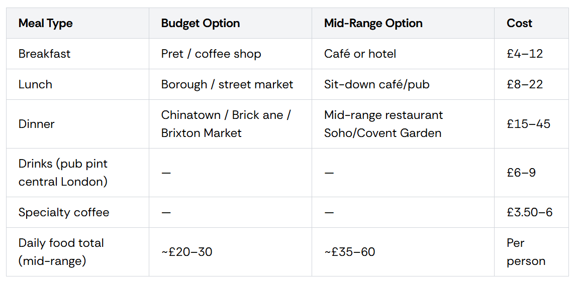 Budget travellers who use London’s markets — Borough Market, Maltby Street Market, Brixton Market, Spitalfields, and the various street food setups in Southwark and Whitechapel — eat extraordinarily well for £10–20 per meal. Avoiding the sit-down tourist restaurants near the Tower of London, Covent Garden (beautiful, overpriced for food), and Leicester Square is the single most impactful food budget decision you can make.