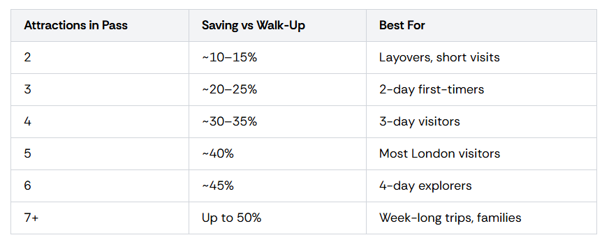 The London Tourist Pass uses a progressive savings model — the structural advantage that separates it from every other attraction pass in London. Unlike flat-rate or tier-based passes where you pay for a bracket and hope you fill it, the LTP’s Build Your Own Pass adjusts your savings in real time as you add attractions. There are no tiers, no upfront guessing, and no mid-trip regret.